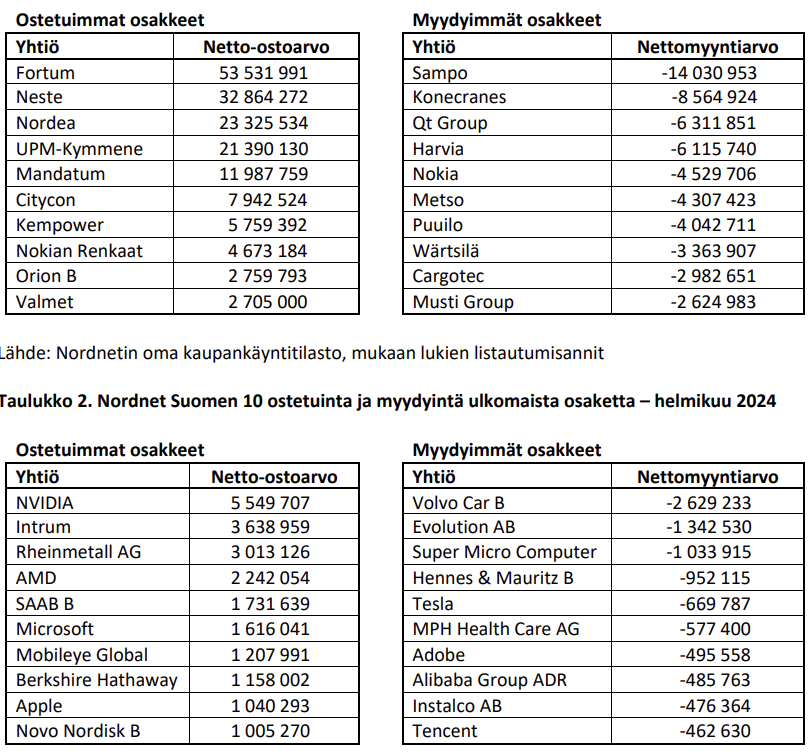 Tekoälyn aallonharjalla ratsastavasta Nvidiasta tuli helmikuussa Nordnetin suomalaisasiakkaiden ulkomaisen osakekaupan selvä ykkönen. Osake oli ulkomaisessa osakekaupassa kuukausitason vaihdetuin sekä eri asiakkaiden lukumäärällä että euromääräisesti mitattuna. Lisäksi osake nousi kuukauden selvästi netto-ostetuimmaksi ulkomaiseksi osakkeeksi.