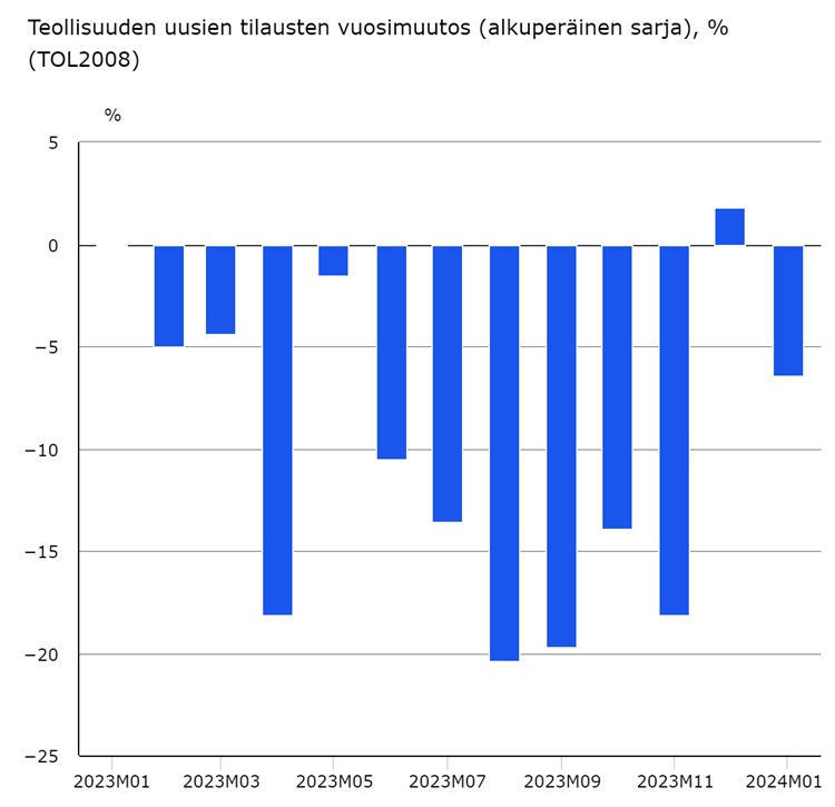 Teollisuuden suhdannetilanteesta saatiin jälleen mollivoittoista tilastotietoa. Teollisuuden uusien tilausten arvo oli Tilastokeskuksen mukaan vuoden 2024 tammikuussa 6,4 prosenttia pienempi kuin vuotta aiemmin. Tilaukset vähenivät kaikilla tarkastelluilla teollisuuden päätoimialoilla.