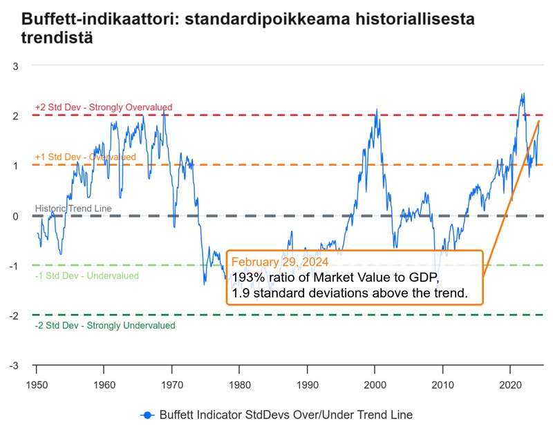 Warren Buffettin suosima osakemarkkinoiden arvostusmittari on tällä hetkellä poikkeuksellisen korkealla.
