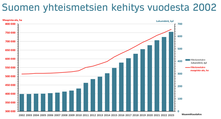 Viime vuoden aikana perustettiin ennätykselliset 46 uutta yhteismetsää. Se on eniten vuodesta 2002 alkaneella tarkastelujaksolla, kertoo Maanmittauslaitos. Yhteismetsien lukumäärä ja maapinta-ala ovat olleet selvässä kasvussa jatkuvasti yli 20 vuoden ajan.