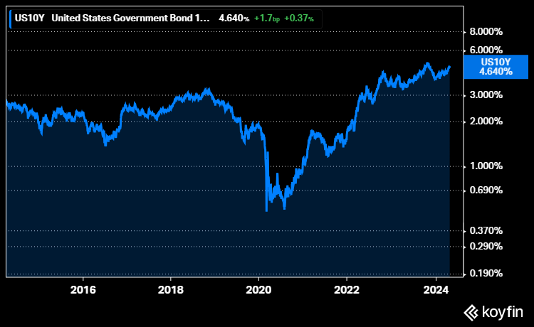 Joukkovelkakirjojen korot ovat nousseet Euroopassa, mutta erityisesti Yhdysvalloissa. USA:n 10-vuoden velkakirjan korko oli vielä vuoden 2020 alussa alle prosentissa, mutta on nyt noussut 4,6 prosenttiin.