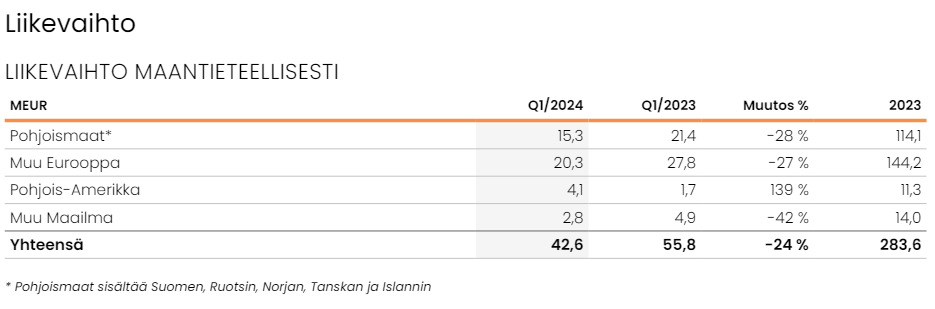 Liikevaihto jäi 43 miljoonaan euroon. Liikevaihto laski viime vuodesta 24 prosenttia. Liikevaihto Pohjoismaiden ulkopuolelle kasvoi kuitenkin roimasti, peräti 64 prosenttia.