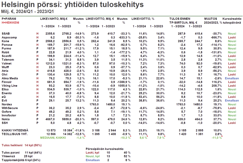 Angervuon laskelmien mukaan raportoineiden yhtiöiden oikaistu liikevoitto on noussut 8,3 prosenttia ja on jo 3,2 miljardia euroa. Tosin keskimmäisen yhtiön liikevoitto on laskenut 10,3 prosenttia, vaikka analyytikoiden ennusten keskimmäisen yhtiön liikevoitosta oli kasvua +3,7 prosenttia. Raportoineiden yhtiöiden tulos rahoituserien jälkeen on yhteenlaskettuna 3,2 miljardia ja kasvua vuoden takaiseen on kertynyt +10 prosenttia.