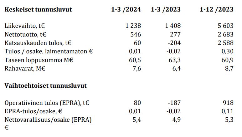Tulos tammi-maaliskuussa ennen veroja oli 0,33 miljoonaa euroa (Q1/2023: -0,20), jota voi pitää nykyisessä kiinteistömarkkinassa hyvänä suorituksena. Ulkopuolinen arvioitsija arvioi kiinteistöjen käyvät arvot puolivuosittain, seuraavan kerran 30.6.2024.
