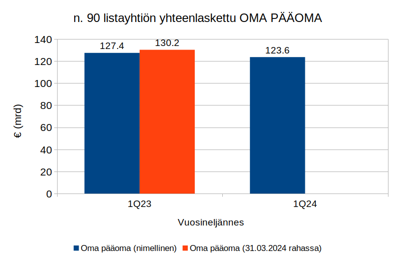 Tarkasteltujen yritysten yhteenlaskettu oma pääoma on kutistunut vuoden aikana noin kolme prosenttia ja on nyt noin 123,6 miljardia euroa.