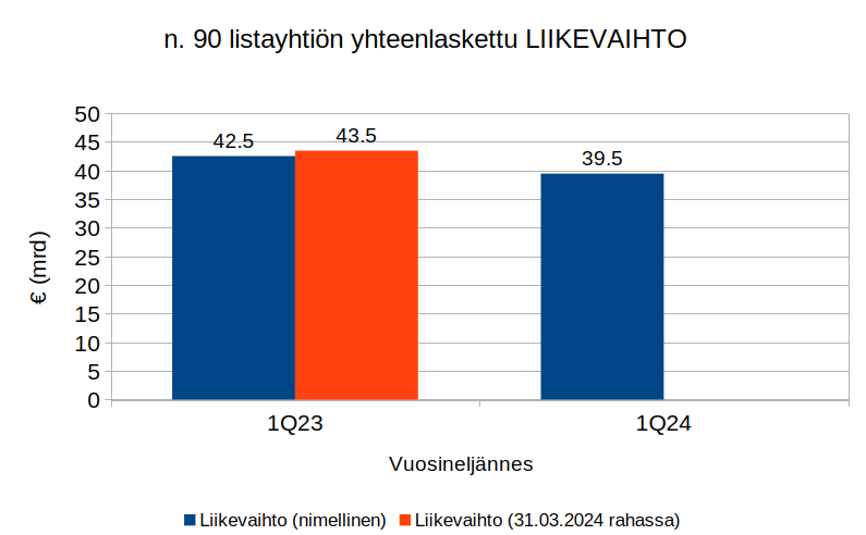 Tarkasteltujen yritysten liikevaihto ensimmäisellä vuosineljänneksellä oli yhteensä 39,5 miljardia euroa. Vuotta aikaisemman vuosineljänneksen aikana yhteenlaskettu liikevaihto oli vastaavasti 42,5 miljardia euroa.