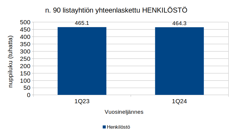 Tarkasteltujen yritysten yhteenlaskettu henkilöstön määrä oli maaliskuun päättyessä noin 464 tuhatta. Vuotta aiemmin määrä oli vastaavasti noin 465 tuhatta. Muutosneuvottelu-uutisia tuntuu tulevan melko taajaan.