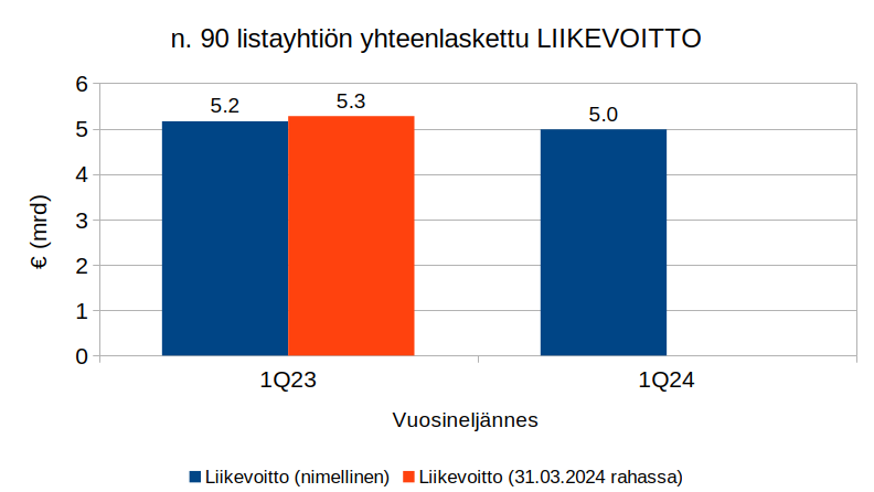 Tarkasteltujen yritysten yhteenlaskettu liikevoitto ensimmäisellä vuosineljänneksellä oli noin 5,0 miljardia euroa. Vuotta aikaisemmin liikevoitto oli vastaavasti yhteensä noin 5,2 miljardia euroa. Laskua liikevoitoissa oli täten euromääräisesti noin kolme prosenttia ja reaalisesti noin kuusi prosenttia. Eniten liikevoitto laski Fortumilla (-198 miljoonaa euroa) ja nousi Nordealla (+283miljoonaa euroa).