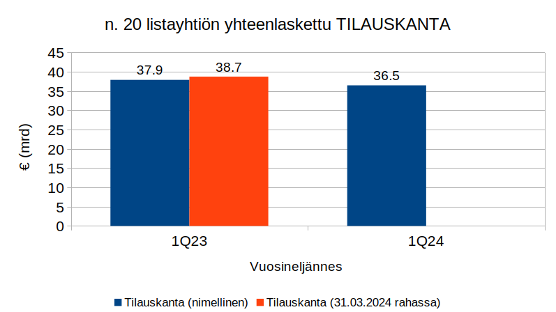 Tässä otoksessa vain parikymmentä yritystä raportoi uusien tilausten määrän ja kertyneen tilauskannan. Näiden yritysten yhteenlaskettu tilauskanta 31.3.2024 oli noin 36,5 miljardia euroa, kun se vuotta aikaisemmin oli näillä samoilla yrityksillä yhteensä 37,9 miljardia euroa. Tilauskanta on siis kutistunut merkittävästi.