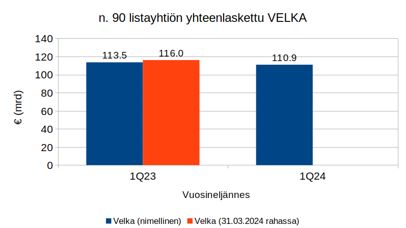 Tarkasteltujen yritysten kokonaisvelka oli yhteensä noin 110,9 miljardia euroa ja vuosi sitten vastaavasti yhteenlaskettu velka oli noin 113,5 miljardia euroa. Velan vähentämistä on siis edelleen jatkettu. Eniten euromääräistä velkaansa vähensi Nokia ja lisäsi vastaavasti Neste.
