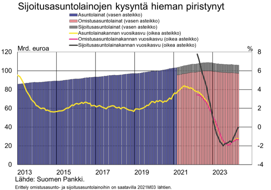 Suomen Pankin mukaan maalis-huhtikuussa 2024 uusia sijoitusasuntolainoja nostettiin 210 miljoonan euron edestä, mikä on 14 prosenttia enemmän kuin vuosi sitten vastaavana aikana. Nostoja kuitenkin tehtiin selvästi vähemmän kuin vastaavana aikana vuosina 2021 ja 2022.