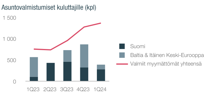 Kuluttajamyynti Suomessa nousi kuitenkin 135 asuntoon viime vuoden 74 asunnosta. Baltiassa ja itäisessä Keski-Euroopassa kysyntä oli vakaata ja kuluttajamyynti kasvoi viidentenä perättäisenä vuosineljänneksenä ja oli 237 asuntoa, kun vuotta aiemmin kuluttajamyynti oli 160 asuntoa.