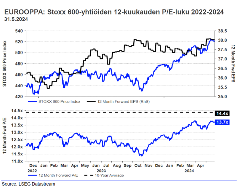 Angervuon mukaan kuluvan vuoden ennusteella laskettu p/e-luku Stoxx 600-indeksiyhtiöille on 13,7, kun pitkäaikainen arvostustaso on ollut 14,4. Osakkeet ovat siis edelleen hiukan alle pitkän aikavälin keskimääräistä arvostustasoa halvempia.