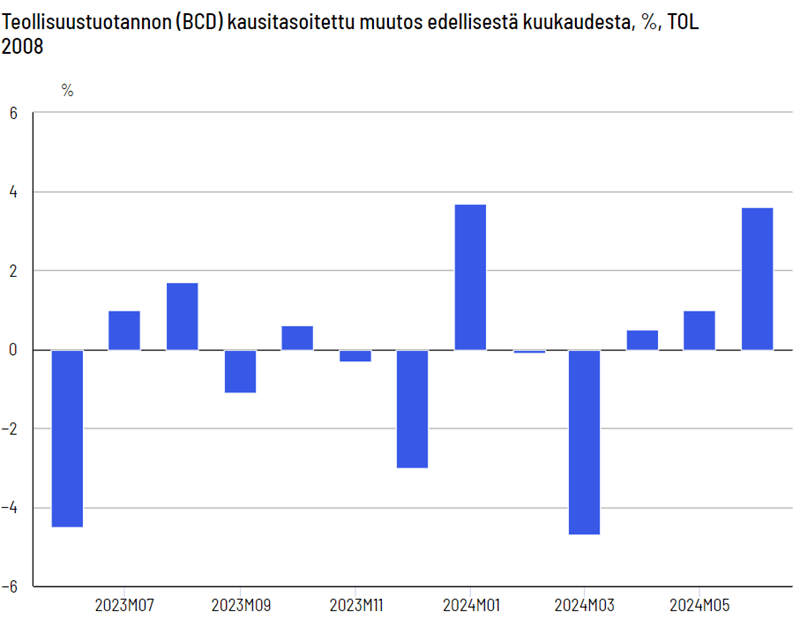 Kausitasoitettu teollisuustuotanto kasvoi Tilastokeskuksen mukaan kesäkuussa 3,6 prosenttia edellisestä kuukaudesta. Työpäiväkorjattu tuotanto kasvoi 3,1 prosenttia verrattuna vuodentakaiseen.