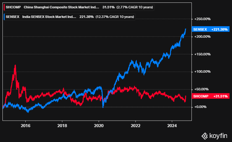 Viimeisen 10 vuoden aikana esimerkiksi Kiinan Shanghain pörssi on noussut vain 32 prosenttia, kun samalla ajanjaksolla Intian Sensex-pörssi on liitänyt yli 220 prosentin nousuun.