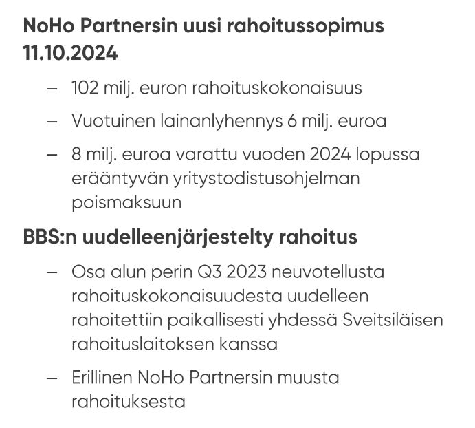 NoHo Partnersin talousjohtaja Jarno Vilponen kertoo, että yhtiö pääsi uusimaan heti katsauskauden jälkeen rahoitussopimuksen, joka vapauttaa merkittävästi kassavirtoja tulevaisuuden kasvuinvestointeihin ja osingonmaksuun: