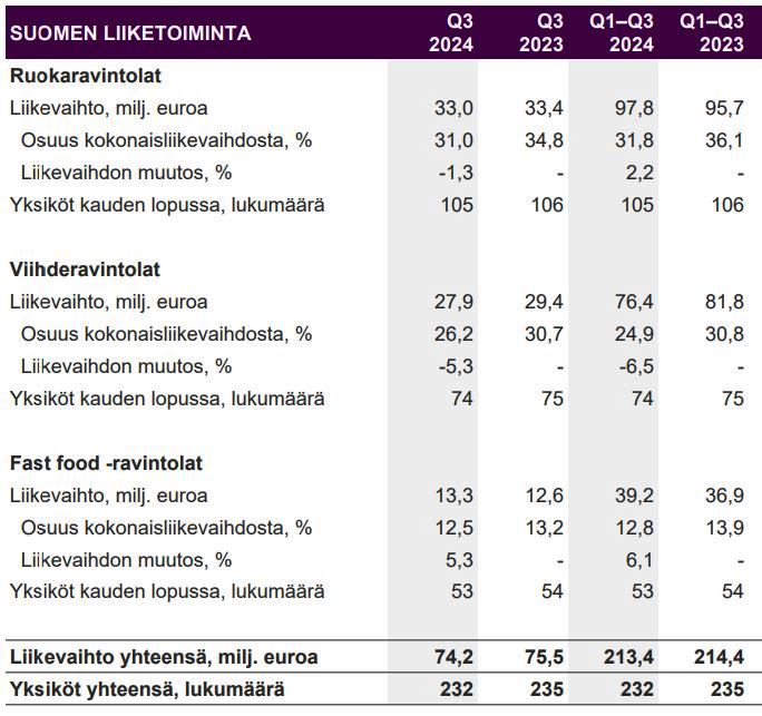 Vaikka Suomen liikevaihto kokonaisuutena laski heinä-syyskuussa vajaa kaksi prosenttia, liikevoittomarginaali säilyi erittäin hyvänä 10,2 prosentissa (Q3/2023: 10,3). Ruokaravintolat menetti 1,3 prosenttia ja Viihderavintolat 5,3 prosenttia liikevaihdostaan. Fast Food kasvoi ilahduttavasti 5,3 prosenttia koostuen pitkälti Friend & Brgrs -ketjusta, jota on tarkoitus kasvattaa uusilla avauksilla myös 2025.