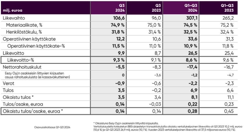 Yhtiö toisti ohjeistuksensa, eli se tavoittelee tänä vuonna noin 430 miljoonan euron liikevaihtoa ja noin 9,5 prosentin liikevoittomarginaalia. Tammi-syyskuussa liikevaihdosta kertyi 307 miljoonaa, jossa on kasvua yritysostoineen 15,8 prosenttia, liikevoittomarginaalin ollessa 8,6 prosenttia.