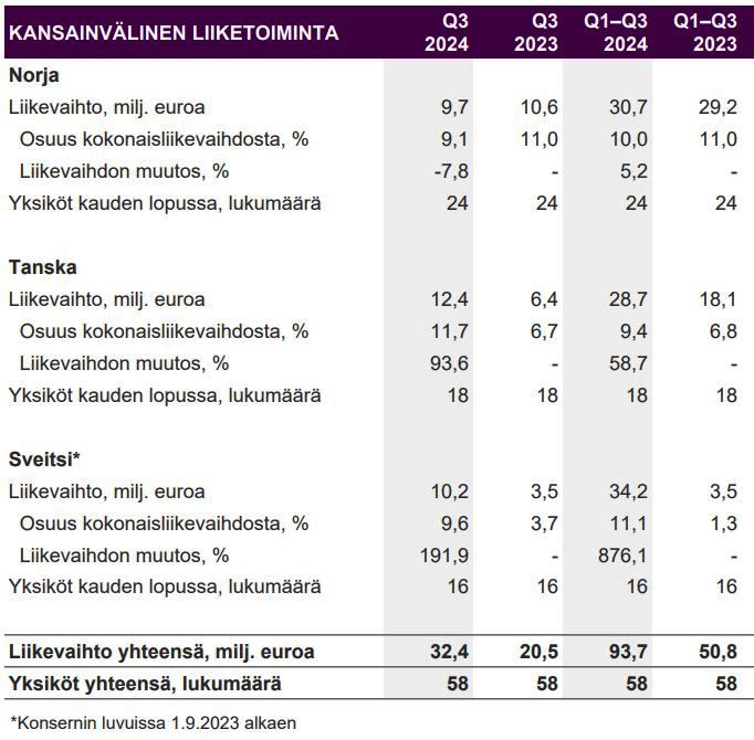 Konsernin kasvu heinä-syyskuussa 2024 oli 11 prosenttia, joka tulee osin yrityskaupoista, kuten Holy Cow!:sta Sveitsissä sekä Triple Tradingistä Tanskassa. Holy Cow! on yhdistelty konsernin lukuihin 1.9.2023 lukien ja Triple Trading -kauppa on tehty keväällä 2024.