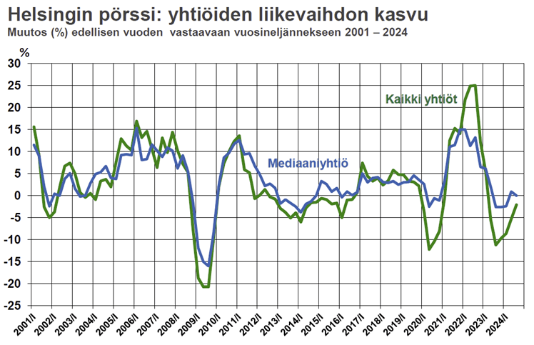 Vuoden 2024 tammi-syyskuussa raportoineiden pörssin päälistan yhtiöiden yhteenlaskettu liikevaihto laski 5,7 prosenttia ja teollisuuden yhteenlaskettu liikevaihto laski 6,4 prosenttia vuoden takaiseen jaksoon verrattuna. Keskimmäisen yhtiön liikevaihto laski 0,3 prosenttia.