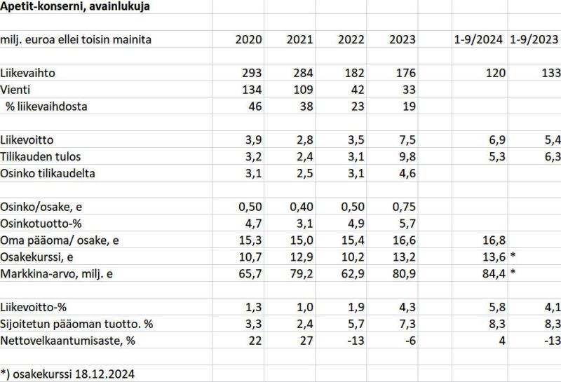 Osakekohtainen tulos tilikaudella 2023 oli 1,56 euroa ja tammi-syyskuussa 2024 vastaavasti 0,85 euroa (1-9/2023: 1,01). Apetit pyrkii osinkopolitiikkansa mukaan jakamaan osinkoa 40-60 prosenttia tilikauden voitosta.