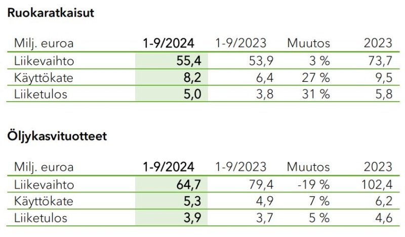 Tulosvuosi 2024 näyttää ohjeistuksen perusteella hyvältä, liikevoiton osalta viime vuoden tasoiselta. Ruokaratkaisuihin yhtiö ennakoi tulosparannusta ja Öljykasvituotteisiin heikennystä markkinahintojen näkymien vuoksi.