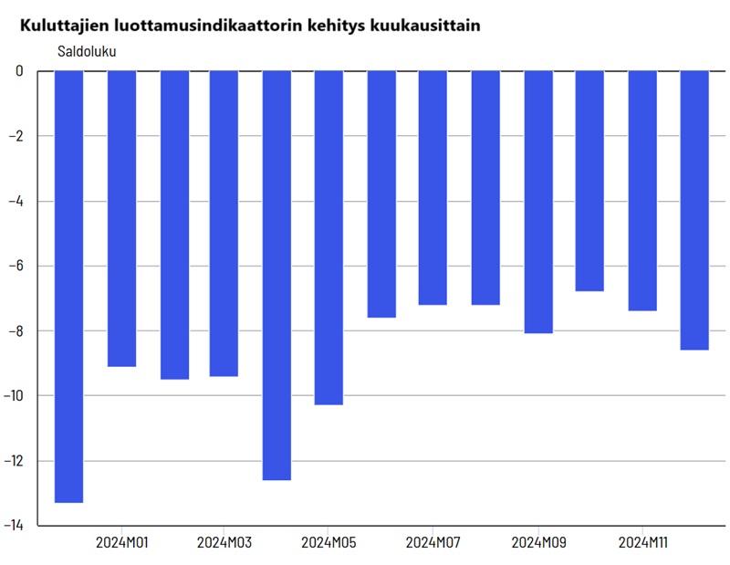 Tilastokeskuksen mukaan kuluttajien luottamusindikaattorin saldoluku oli joulukuussa -8,6, kun se oli marraskuussa -7,4 ja lokakuussa -6,8. Vuotta aiemmin joulukuussa luottamusindikaattori sai arvon -13,3.