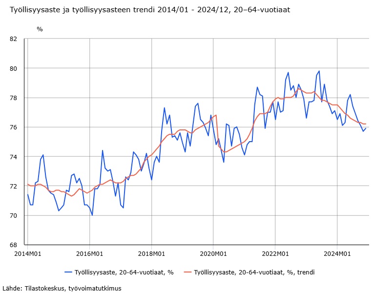 20–64-vuotiaiden kausitasoittamaton työllisyysaste eli työllisten osuus 20–64-vuotiaista oli joulukuussa 75,9 prosenttia, kun se vuotta aiemmin oli tässä ikäryhmässä 77,1 prosenttia.