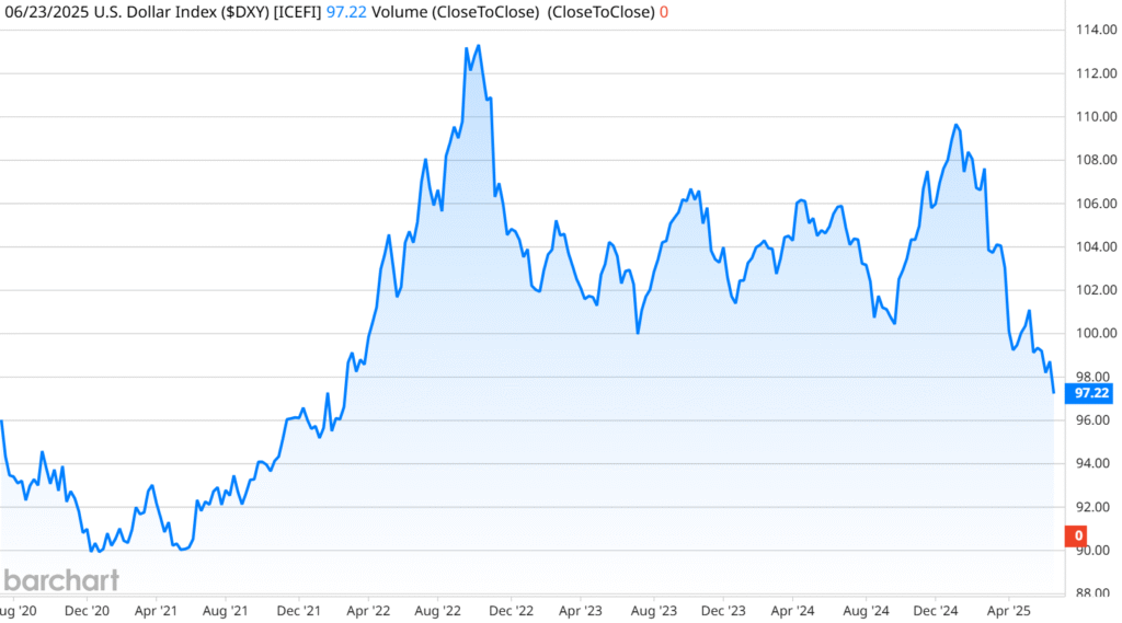 Yhdysvaltain dollari on ajautunut jyrkimpään alamäkeensä vuosikymmeniin, kun dollarin indeksi (DXY) laski perjantaina tasolle 97,2, mikä on matalin taso sitten maaliskuun 2022.