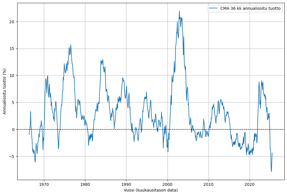 Tämän artikkelin alussa olevassa kuvassa on esitetty investointifaktorin (CMA, konservatiivisesti ja aggressiivisesti investoivien yritysten portfolioiden tuottoero) rullaava 36 kuukauden annualisoitu tuotto.