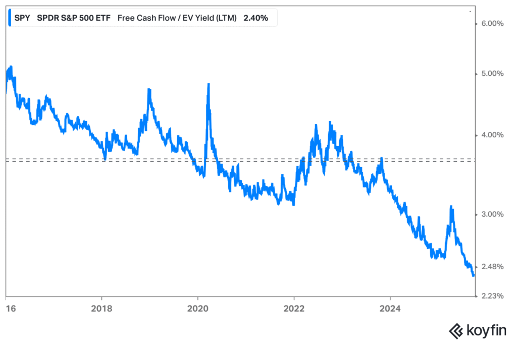 S&P 500 -indeksin yhtiöiden vapaan kassavirran tuotto onkin laskenut matalimmalle tasolleen sitten IT-kuplan (myös ennen finanssikriisiä tuotto kävi hetkellisesti alempana). Tällä hetkellä S&P 500 -indeksin vapaan kassavirran tuotto on 2,4 prosenttia, kun viimeisen 10 vuoden keskiarvo ja mediaani ovat 3,6 ja 3,7 prosenttia. 2,4 prosentin vapaa kassavirta tarkoittaa, että indeksin yritykset maksaisivat yritysarvonsa takaisin noin 42 vuodessa, jos kassavirta pysyisi ennallaan.