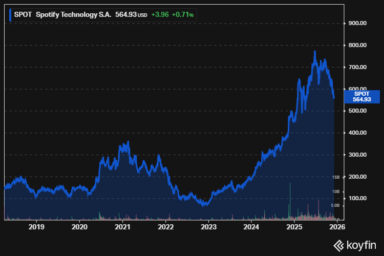 Spotifyn osakekurssi on noussut vuosien varrella varsin hyvin, sillä yhtiön markkina-arvo on 116 miljardia dollaria. Yhtiön osakurssi on noussut vuoden 2025 alusta 23 prosenttia ja 12 kuukauden aikana 17 prosenttia.