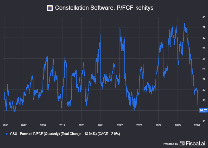 Kolmanneksi pelätään, että tekoäly murentaa rakenteellisesti ohjelmistosektorin arvostuskertoimia. Kun pääoma virtaa kohti AI-infraa, puolijohteita ja suuria mallitaloja, sijoittajat voivat olla haluttomampia maksamaan aiempaa preemiota hitaammin kasvavasta, yritysostoihin nojaavasta ohjelmistoyhtiöstä. Tällöin Constellation Software voi ajautua tilanteeseen, jossa liiketoiminta jatkaa kasvuaan, mutta kerrointen laajeneminen jää historiaan.