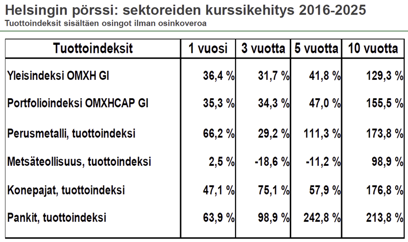 Viime vuosien voittaja on ollut pankit, joiden tuottoindeksi nousu viime vuonna oli 63,9 prosenttia, kolmen vuoden tuotto 98,9 prosenttia ja viiden vuoden tuotto 242,8 prosenttia.
