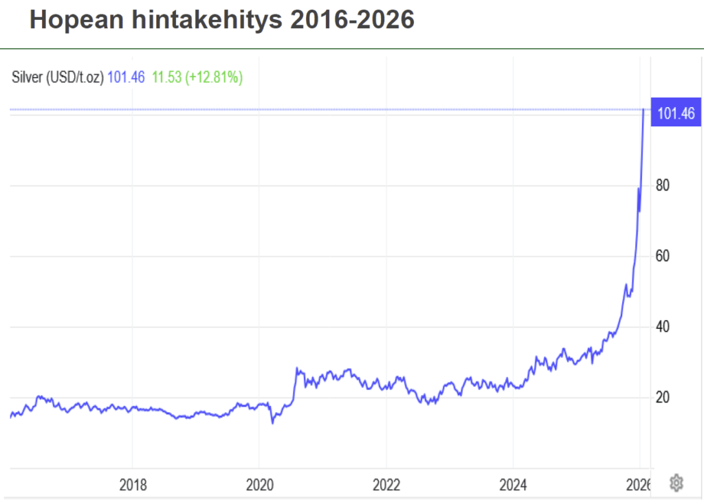 Perjantaina hopean hinta nousi ensimmäistä kertaa historiassa yli 100 USA:n dollarin rajan unssilta. Hopean hinta on noussut vuodessa 232 prosenttia ja kuukauden aikana 41 prosenttia.