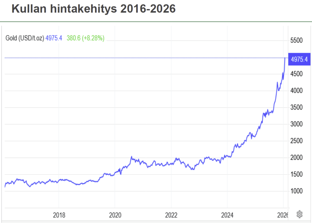 Kullan hinta on noussut vuodessa 80 prosenttia ja kuukaudessa noin 11 prosenttia. Markkinaennusteet perjantaina uskoivat kullan hinnan mahdollisesti nousevan 5500 dollariin eli noin 10 prosenttia perjantain lähes 5000 dollarin tasosta vuoden 2026 loppuun mennessä.
