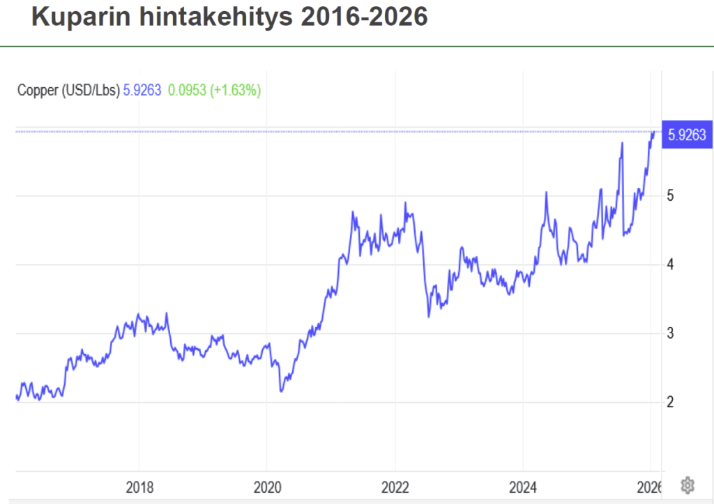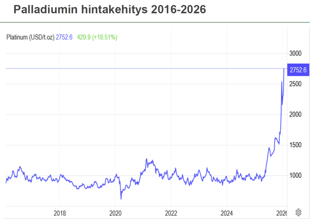 Kuparin hinta on noussut vuodessa 38 prosenttia ja kuukaudessa 7,7 prosenttia. Palladiumin hinta on noussut vuodessa 104 prosenttia ja kuukaudessa 12,3 prosenttia.