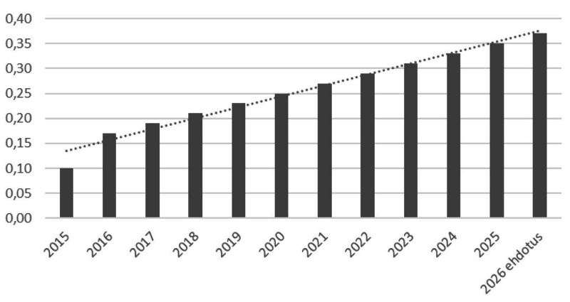 Vuosi sitten perusosinko oli 0,35 euroa osakkeelta. Nyt esitys on 0,37 euroa. Se tekee yhteensä 2,36 miljoonaa euroa osakemäärän ollessa 6,39 miljoonaa euroa. Summa on tarkoitus jakaa kahdessa erässä, kuten viime vuonna.