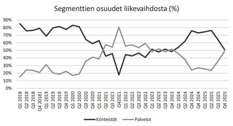Kuten viime analyysissa 11.11.2025 kirjoitimme, Palvelut-segmentin loiva käänne parempaan alkoi jo kolmoskvartaalilla. Elokuusta alkaen kulurakenne on ollut parempi. Kun Palveluiden kolmannen neljänneksen tulos oli 43 tuhatta euroa, viimeisellä kvartaalilla se oli jo 0,33 miljoonaa.