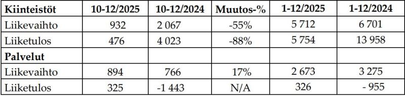 Kiinteistöt-segmentin liiketulos painui kolmoskvartaalin 0,58 miljoonasta 0,48 miljoonaan euroon, mutta viimeinen neljännes sisältää käyvän arvon muutoksia -0,15 miljoonaa euroa perustuen AKA-auktorisoitujen kiinteistöarvioijien arvonmäärityksiin, toisaalta myös positiivista alv-palautusta 0,13 miljoonaa euroa.