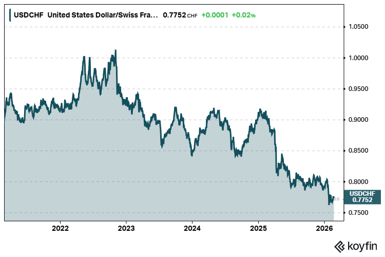 Frangi on vahvistunut dollaria vastaan noin 14 prosenttia viimeisten 12 kuukauden aikana. Uutistoimisto Bloombergin mukaan valuutta saavutti helmikuussa 11 vuoden korkeimman tason dollaria vastaan ja nousi samalla ennätyslukemiin myös euroissa mitattuna.