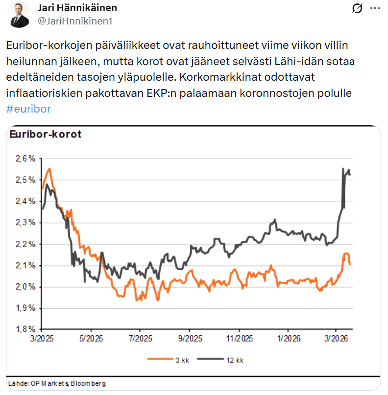 ”Kokouksen päähuomio oli Lähi-idän konfliktin vaikutusten puimisessa. EKP painotti epävarmuuden kasvaneen merkittävästi konfliktin seurauksena, mutta keskipitkän aikavälin talousvaikutukset riippuvat konfliktin voimakkuudesta sekä kestosta.”, toteaa OP Pohjolan sijoittajakirjeessä pankin seniorimarkkinaekonomisti Jari Hännikäinen.