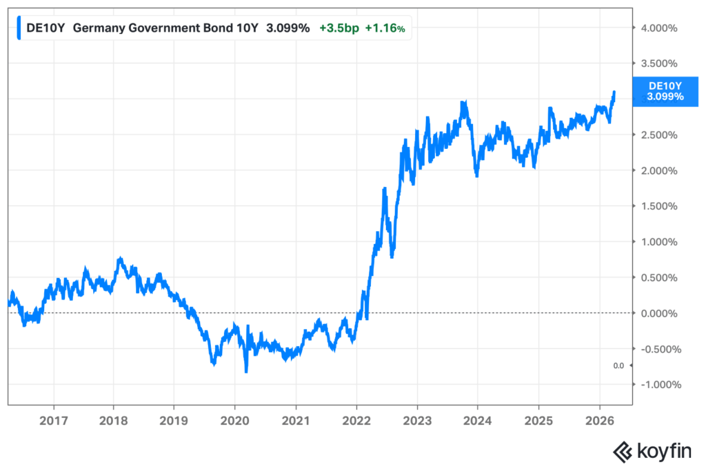 Hormuzinsalmen sulkeutuminen Iranin konfliktin seurauksena on sysännyt raakaöljyn hinnan yli sadan dollarin tynnyriltä ja herättänyt sijoittajat uudelleen pelkäämään inflaatiota. Saksan kymmenvuotisen viitelainan, niin sanotun Bundin, tuotto on noussut 3,1 prosenttiin, korkeimmalle tasolle sitten toukokuun 2011, ja kuukaudessa nousua on kertymässä lähes 50 korkopistettä.