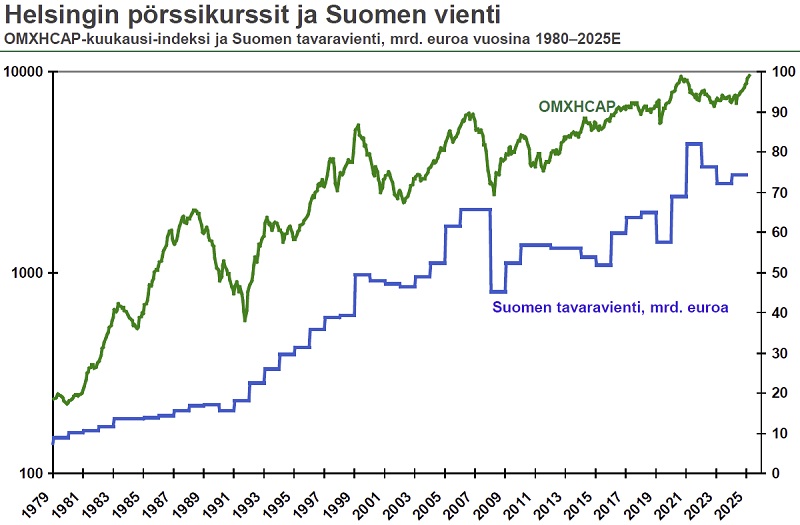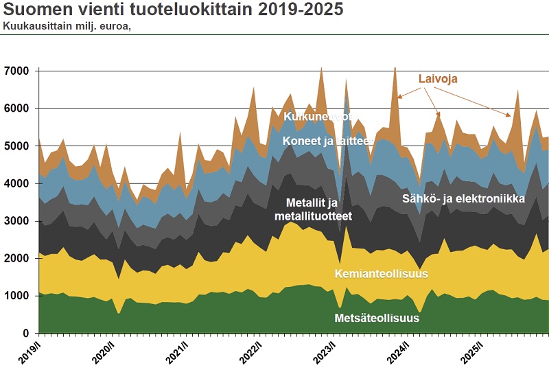 Maamme tavaravienti laski vuosina 2023–2024, mutta kääntyi kasvuun vuonna 2025. Viennin kasvun kääntyminen johtui lähinnä lähes 2,0 miljardin loistoristeilijätoimituksesta viime heinäkuussa ja kullan viennin noin 700 miljoonan euron kasvusta.