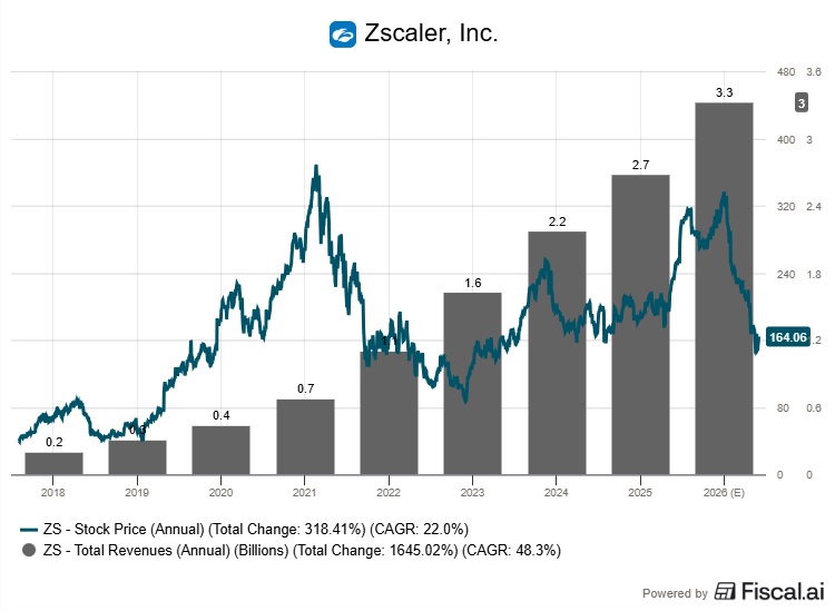 Zscalerin osake on yhä 60 prosenttia vuoden 2021 huippunsa alapuolella. Tuolloin teknologiamarkkinoiden ylikuumeneminen nosti yhtiön arvostuksen kestämättömälle tasolle. Yhtiötä seuraavista analyytikoista enemmistö antaa kuitenkin osakkeelle ostosuosituksen, ja konsensuksen tavoitehinta viittaa merkittävään nousupotentiaaliin nykytasolta.