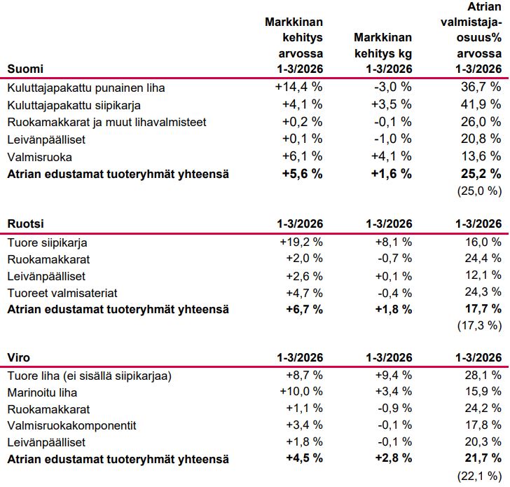Suomessa vähittäiskaupan markkina piristyi Atrian tuoteryhmissä huomattavasti siitä, mitä se oli alkuvuonna 2025. Toki suunta alkoi kääntyä jo viime vuoden puolella. Tammi-maaliskuussa 2026 markkina kasvoi arvossa mitattuna jopa 5,6 prosenttia, kun vertailukaudella oli laskua 3,5 prosenttia.