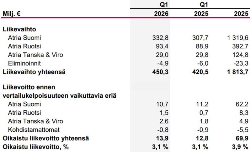 Atria Suomen kasvu oli todella pirteää kahdeksan prosentin tasoa tammi-maaliskuussa 2026 ja se tuli kaikista kanavista, eritoten vähittäiskaupasta. Myös foodservice- eli ravintolamyynti sekä vienti ja teollisuuskauppa kasvoivat.