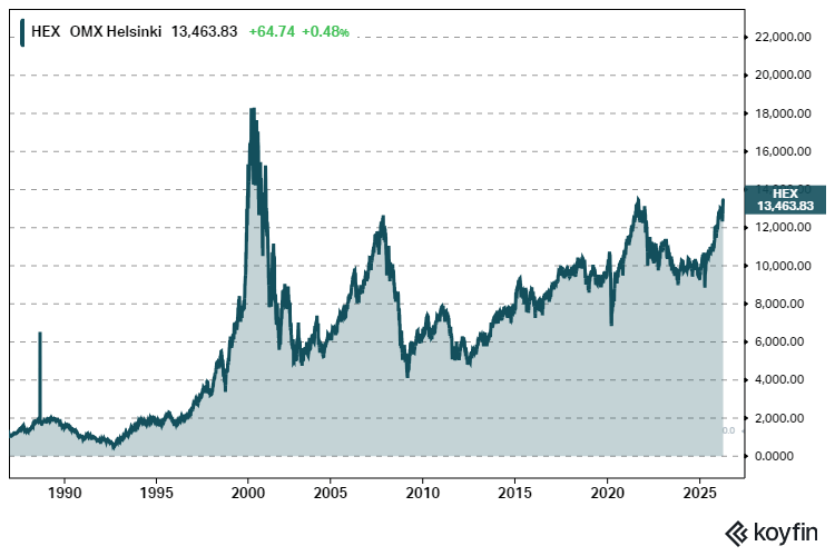Helsingin pörssin yleisindeksi vuosina 1987-2026.