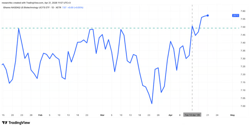 Nostamme bioteknologian tällä viikolla vahvoina pitämiemme teemojen joukkoon. iShares Nasdaq US Biotechnology UCITS ETF -rahaston kurssi on kehittynyt suhteellisesti vahvasti läpi koko Lähi-idän konfliktin, ja viime viikolla se on noussut uusiin ennätyslukemiin.