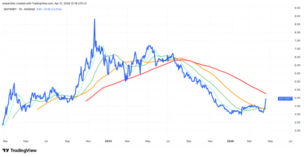 Kun MSTR:n kurssia peilataan bitcoinia vastaan IBIT-rahaston kautta, MSTR/IBIT-suhde on noussut viime viikon aikana maaliskuun paikallisen huipun yläpuolelle. Samalla suhde on ylittänyt niin 20, 50 kuin 100 päivän liukuvat keskiarvonsa.
